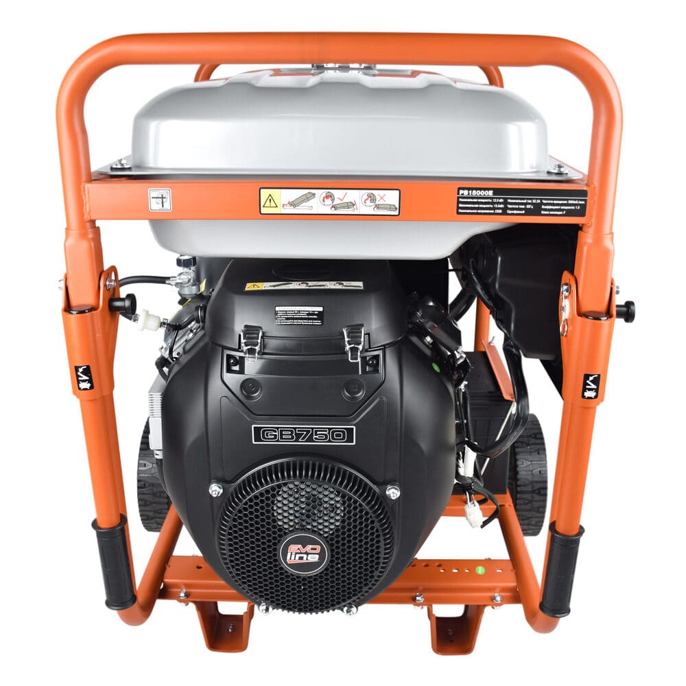 Однофазный бензогенератор EVOline PB 15000 E с двигателем GB 750 и регулятором напряжения AVR. Для комфортного запуска установлен электростартер. Бак, объёмом 55 литров обеспечивает долгую непрерывную работу. Генератор бензиновый EVOline PB 15000 E оборудован двумя розетками 16А и двумя силовые розетками 32А.Комплект для транспортировки с колесами облегчает транспортировку генератора.